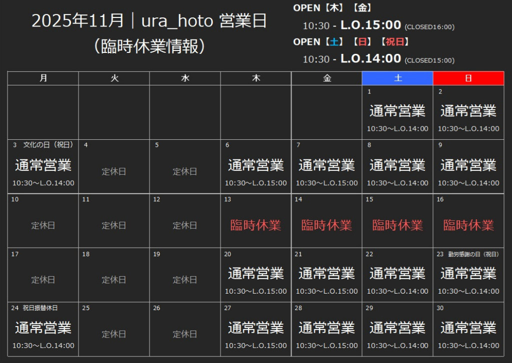 臨時休業情報|2025年11月