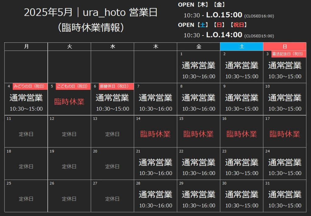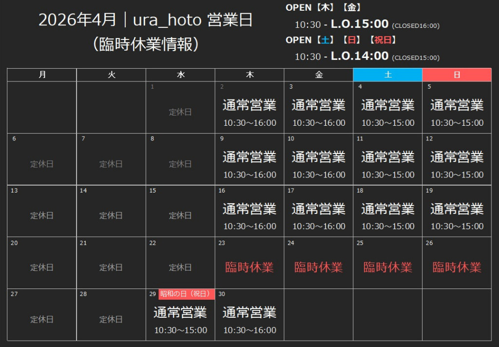 2026年4月 & 5月の営業日