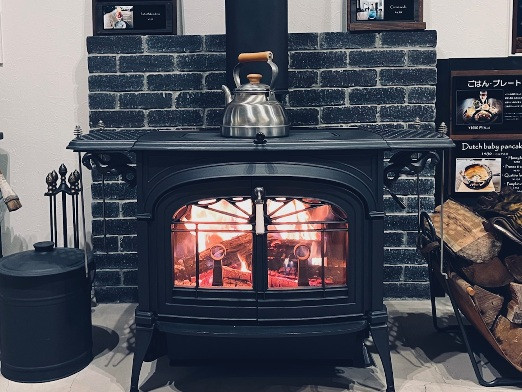 冬朝は薪を焚べるところから始まります..